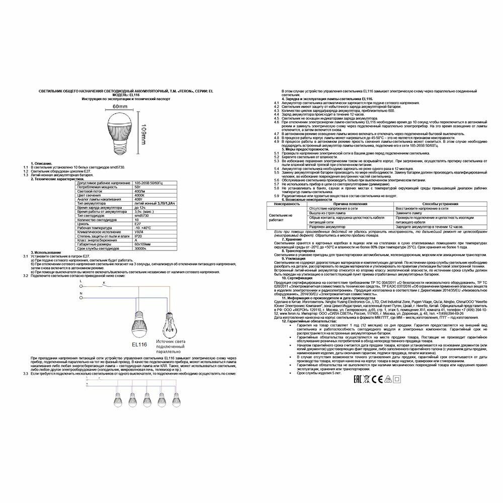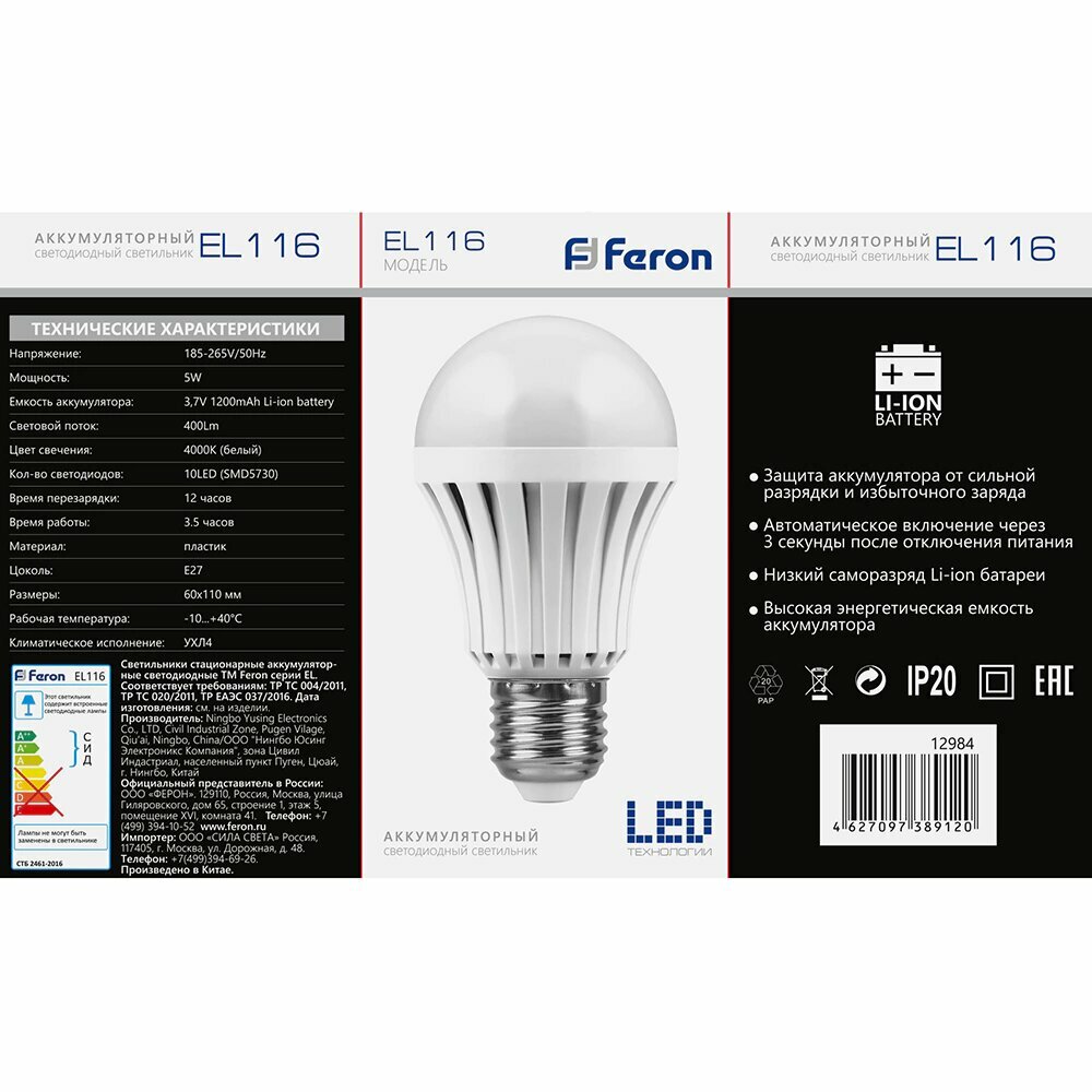 Светильник аккумуляторный, 5W Е27 AC/DC (литий-ионная батарея), белый, EL116 FERON 12984 fr_12984