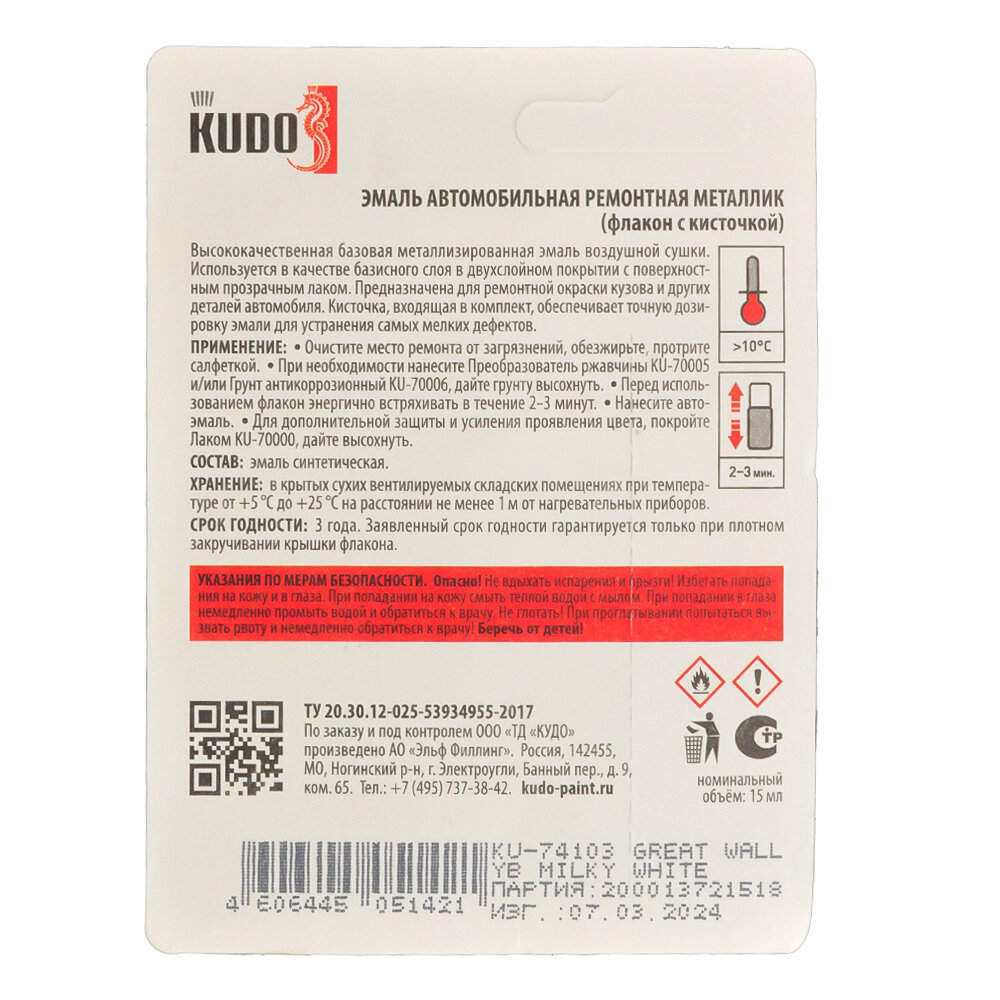 Купить Эмаль автомобильная с кисточкой KUDO GREAT WALL/HAVAL YB MILKY WHITE 15 гр Ku-74103
