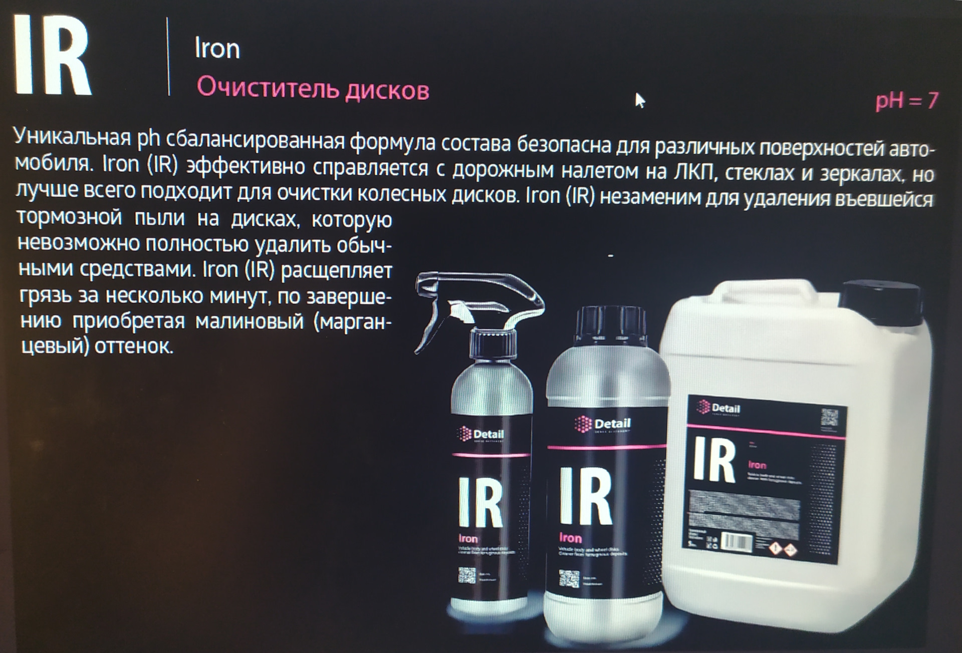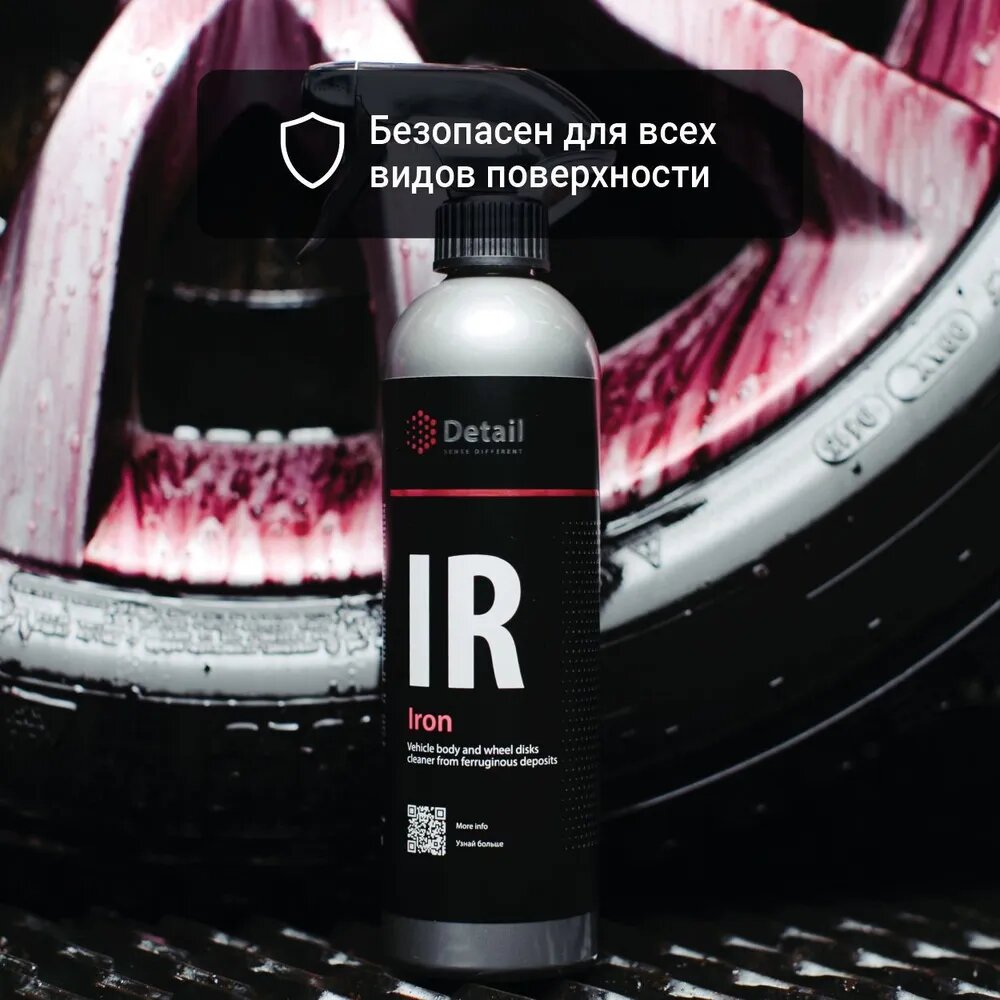 | Дополнительная информация | Уникальная pH-сбалансированная формула состава Iron (IR) безопасна для различных поверхностей автомобиля. Iron (IR) эффективно справляется с дорожным налетом на ЛКП, стёклах и зеркалах. Состав разработан специально для очистки колесных дисков. Iron (IR) незаменим для удаления въевшейся тормозной пыли на дисках, которую невозможно полностью очистить обычными средствами. Iron (IR) расщепляет загрязнение за несколько минут, по завершении приобретая малиновый (марганцевый) оттенок. |