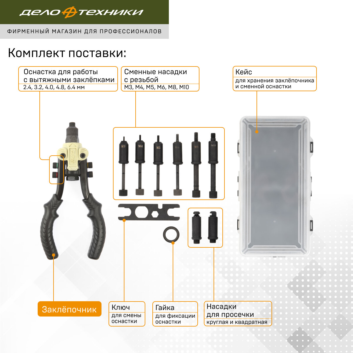 | Подробная комплектация | 1. Заклёпочник. 2. Держатель насадок для работы с вытяжными заклёпками. 3. Сменные насадки: 2.4, 3.2, 4.0, 4.8, 5.6 мм. 4. Тяга для работы с вытяжными заклёпками. 5. Сменные насадки с резьбой: M3, M4, M5, M6, М8, М10. 6. Направляющая втулка для работы с резьбовыми заклёпками. 7. Насадки для просечки: круглая, квадратная. 8. Направляющая втулка для работы с просекателем. 9. Гайка для фиксации оснастки. 10. Ключ многофункциональный. |