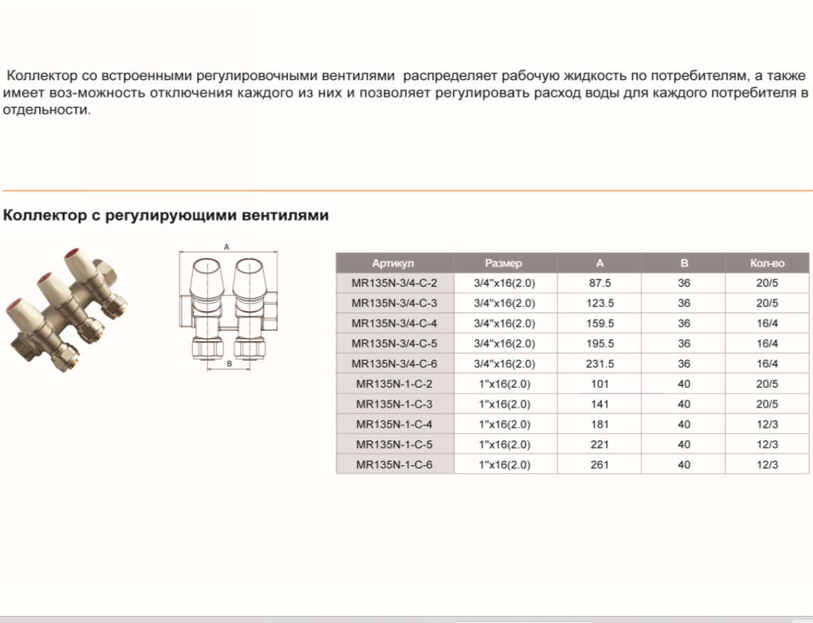 Коллектор MR135N-3/4-C-2, 3/4"х16 мм