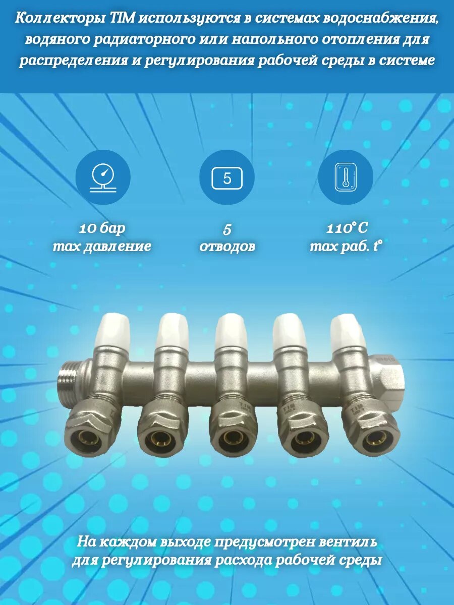 Коллектор вентильный для отопления теплого пола и водоснабжения с евроконусами TIM 1-16-5 выходов MR135N-1-C-5
