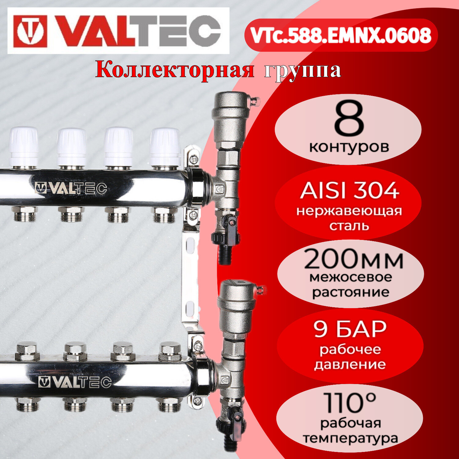 Купить Коллектор VALTEC с термостатическими клапанами, из нержавеющей стали, 1", 8 выходов, комплектован: автовоздухоотводчик, сливной кран. VTc.588.EMNX