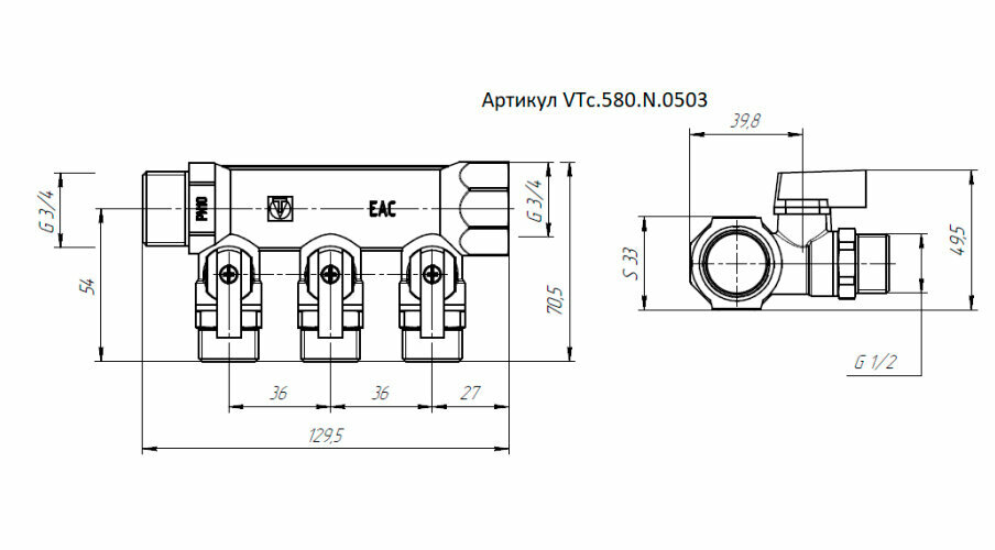 Коллектор с кранами 3 выхода х 1х 1/2 НР (1/20) Valtec VTc.580.N.0603