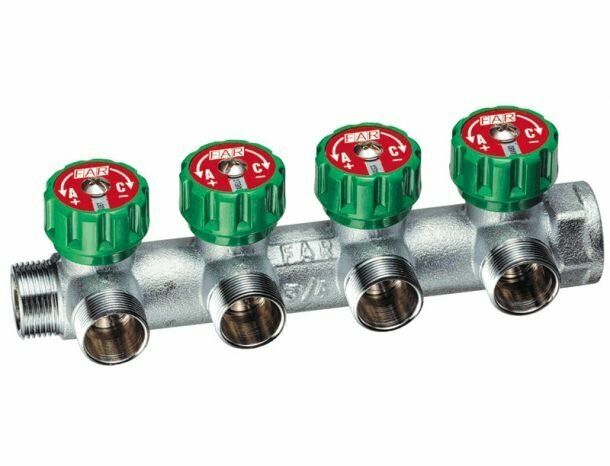 Коллектор FAR 1"х1/2" 4 выхода под конус хромированный с вентилями