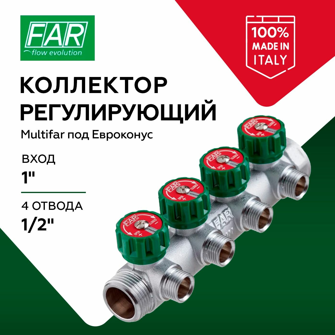 Купить Коллектор FAR 1"х1/2" 4 выхода под конус хромированный с вентилями