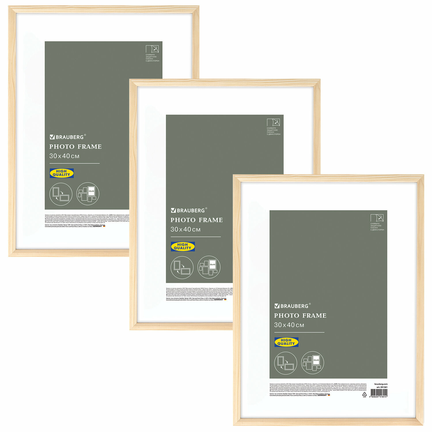 Рамка для фото А4, фоторамка 21х30 см для фотографий, картин, грамот, вышивки небьющаяся, набор 3 штуки, багет 12мм натуральное дерево, Brauberg, цвет натуральный, 391388