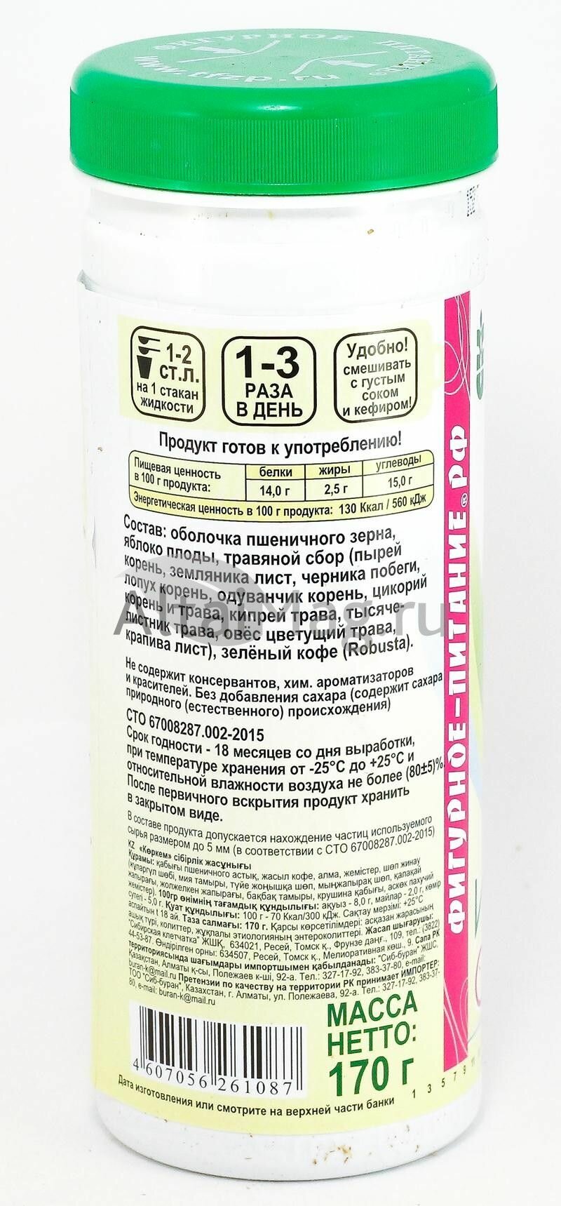 | Состав | оболочка пшеничного зерна, яблоко плоды сушеные, травяной сбор сушеный (пырей корень, земляника лист, черника побеги, лопух корень, одуванчик корень, цикорий корень и трава, кипрей трава, тысячелистник трава, овёс цветущий трава, крапива лист), зелёный кофе (Robusta) |