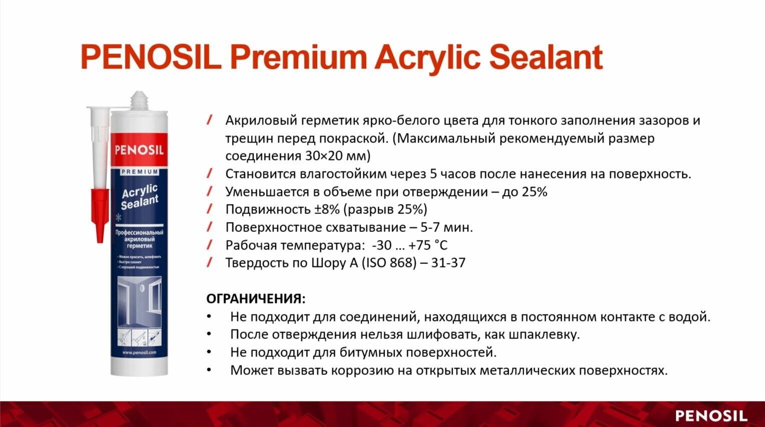 | Дополнительная информация | Не походит для швов с заметной подвижностью (более чем 12,5% от ширины шва). Не подходит для использования в соединениях с битумными поверхностями. На незащищенной металлической поверхности может обусловить коррозию. В затвердевшем виде не шлифуется, как шпаклевка. |