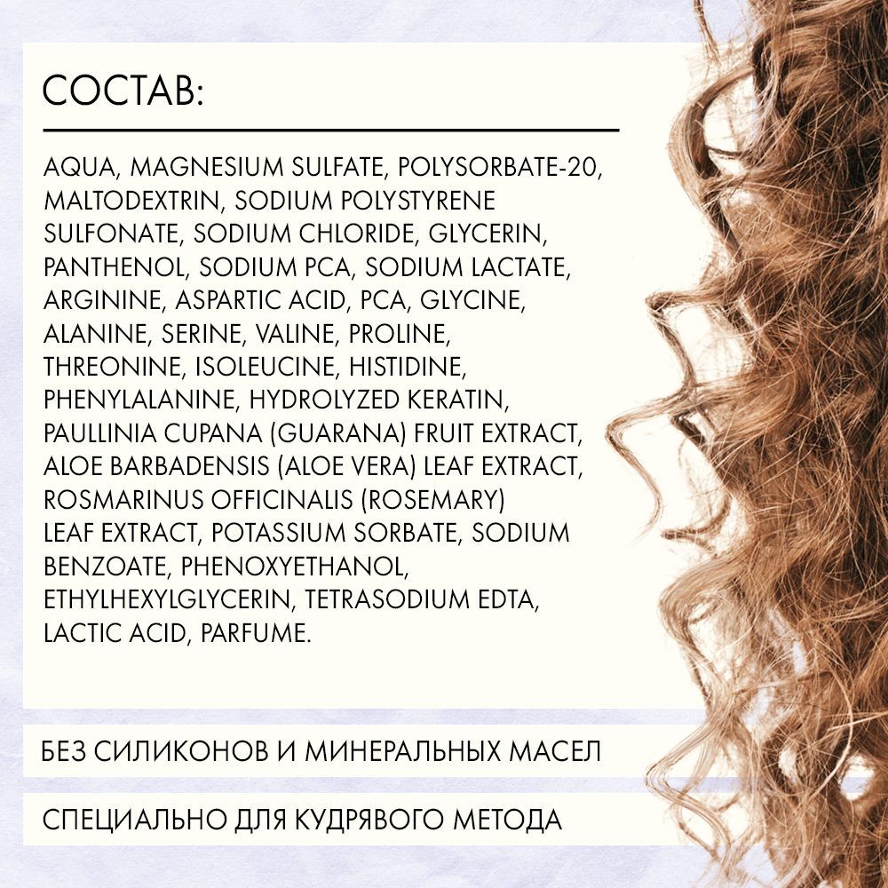 | Состав | Aqua, Magnesium Sulfate, Polysorbate-20, Maltodextrin, Sodium Polystyrene Sulfonate, Sodium Chloride, Glycerin, Panthenol, Sodium PCA, Sodium Lactate, Arginine, Aspartic Acid, PCA, Glycine, Alanine, Serine, Valine, Proline, Threonine, Isoleucine, Histidine, Phenylalanine, Hydrolyzed Keratin, Paullinia Cupana (Guarana) Fruit Extract, Aloe Barbadensis (Aloe Vera) Leaf Extract, Rosmarinus Officinalis (Rosemary) Leaf Extract, Potassium Sorbate, Sodium Benzoate, Phenoxyethanol, Ethylhexylglycerin, Tetrasodium EDTA, Lactic Acid, Parfume |