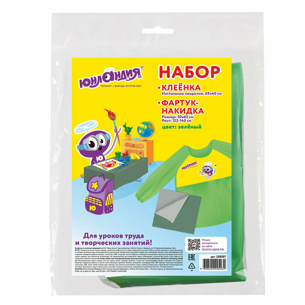 Набор для уроков труда юнландия, клеенка ПВХ 40x69 см, фартук-накидка с рукавами, зеленый, 228357, 228357