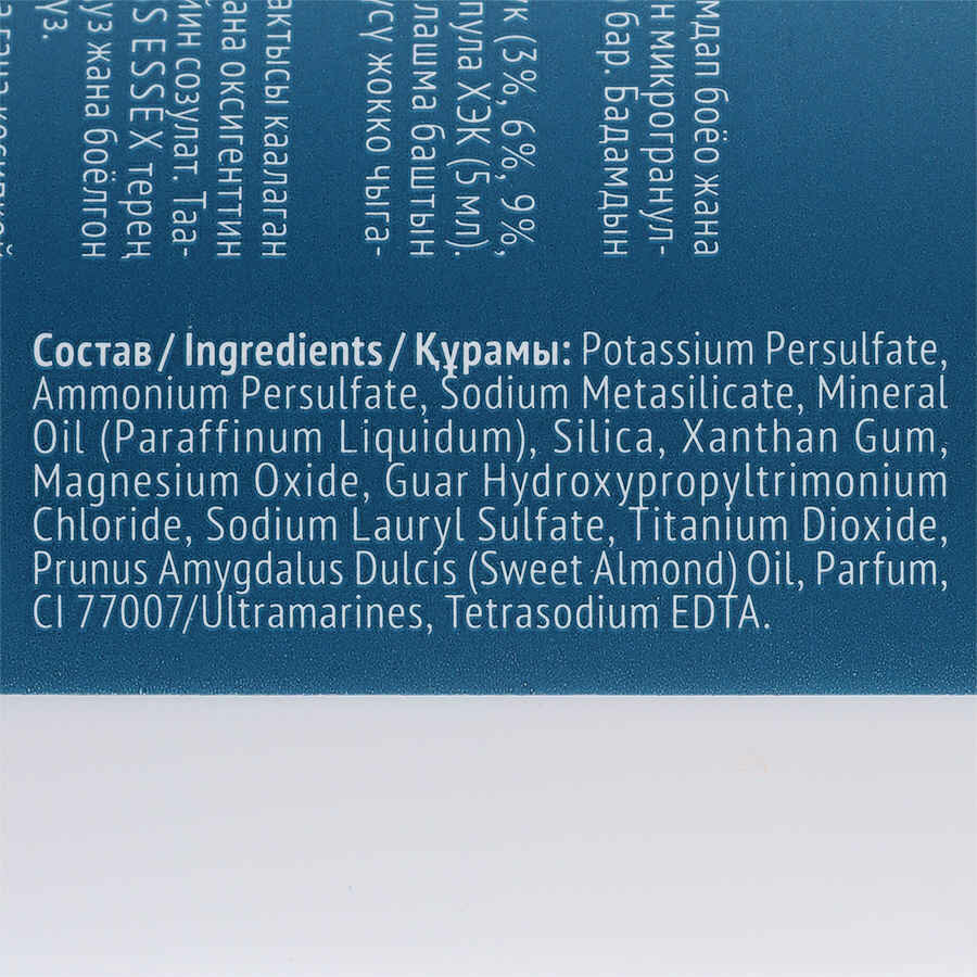 | Состав | аммония пероксидсульфат, калия пероксидсульфат, диоксид титана, магния оксид, гуар гидроксипропилтримониум хлорид, натрия лаурилсульфат, минеральное масло, парфюм, силика, ксантановая камедь, натрия метасиликат, миндальное масло |