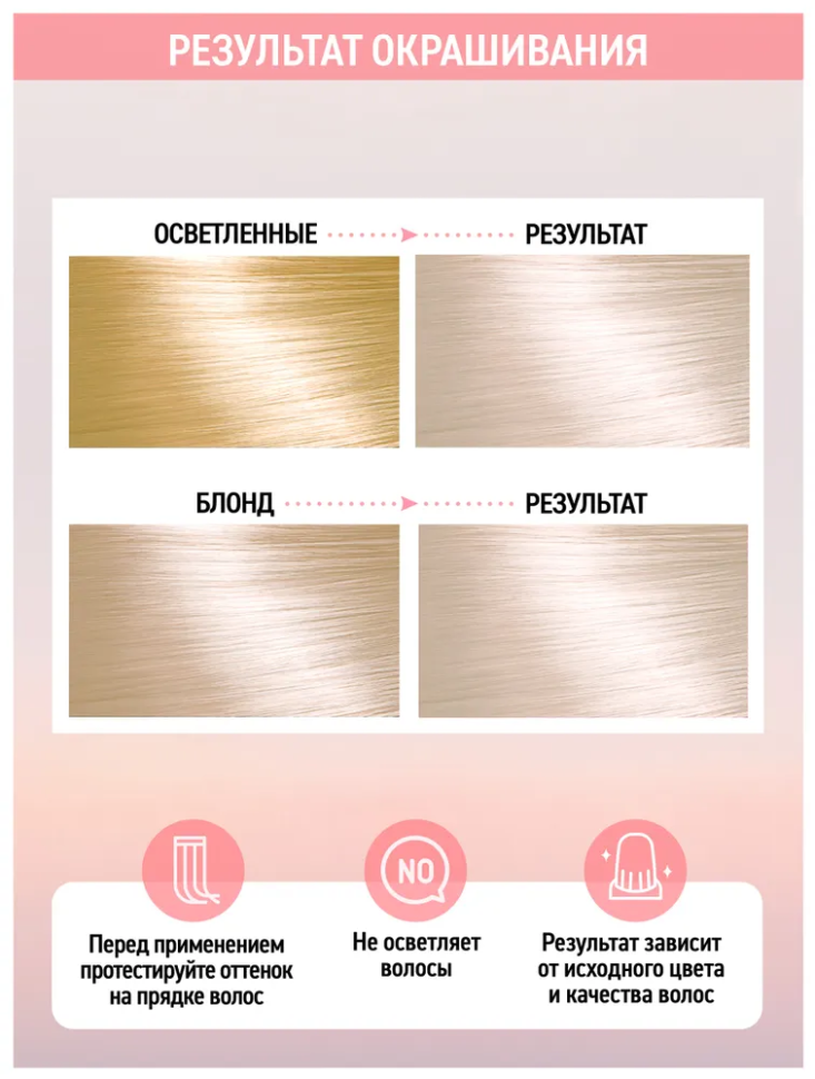 | Дополнительная информация | важно подобрать необходимый для тебя способ применения и нужное время выдержки в зависимости от степени осветления волос, перед окрашиванием рекомендуется провести тест на отдельной пряди, отметив время проявления желаемого результата |