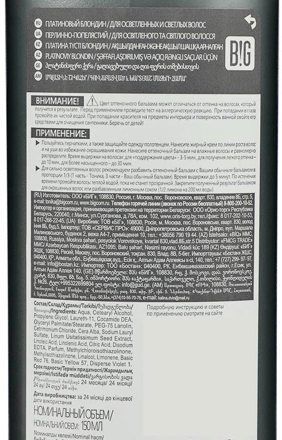 | Способ применения | нанесите оттеночный бальзам на влажные чистые волосы и равномерно распределите. Оставьте на волосах 3-5 минут для поддержания цвета, до 10 минут для получения более легкого оттенка, до 30 минут для получения более насыщенного оттенка. После окрашивания тщательно промойте волосы до тех пор, пока вода не станет прозрачной. Закрепите полученный результат бальзамом для окрашенных волос |