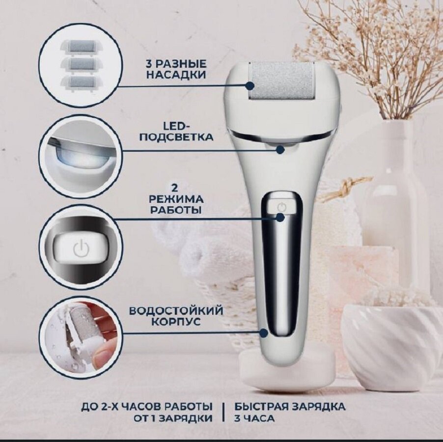 Электрическая пилка для пяток с дисплеем и подсветкой. Набор сменных насадок для роликовой пилки светлые 3 шт.