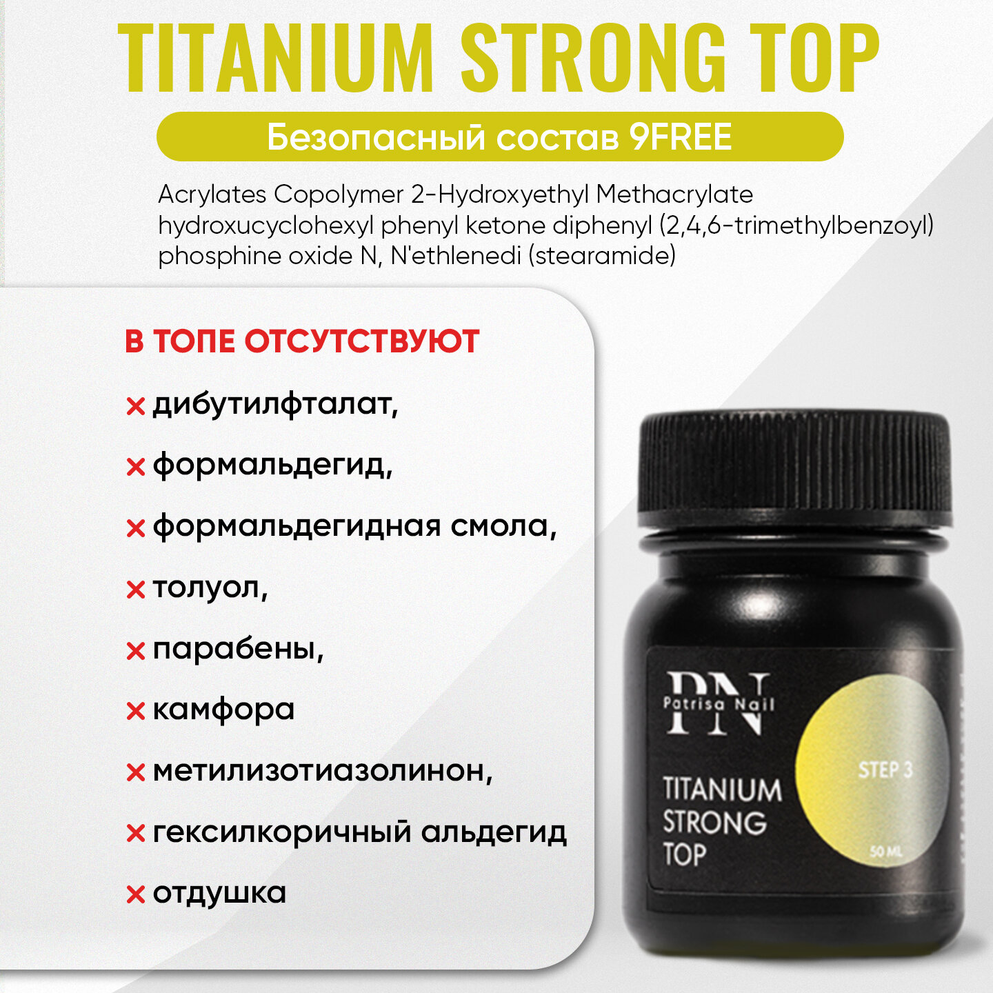 Купить Укрепляющий топ для ногтей Patrisa Nail Titanium Strong Top, без липкого слоя, 50 мл