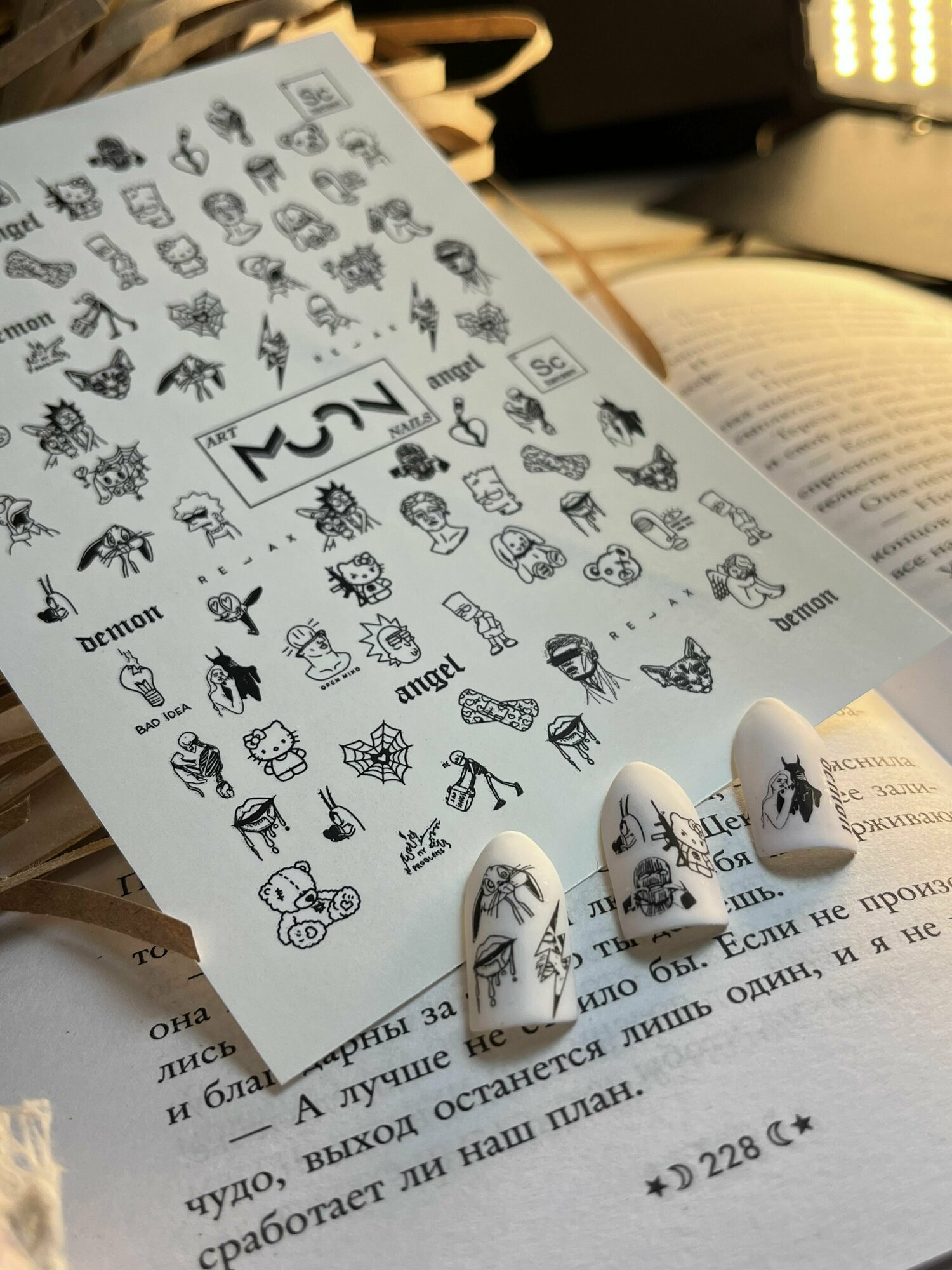 Наклейки для ногтей MOON , слайдеры на водной основе, черно-белые 10 х 13.5 см