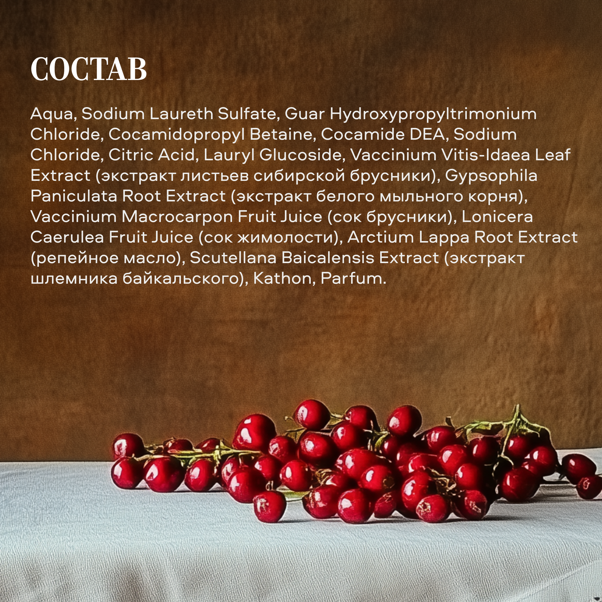 | Состав | aqua, Sodium Laureth Sulfate, Guar Hydroxypropyltrimonium Chloride, Cocamidopropyl Betaine, Cocamide DEA, Sodium Chloride, Citric Acid, Lauryl Glucoside, Vaccinium Vitis-Idaea Leaf Extract (экстракт листьев сибирской брусники), Gypsophila Paniculata Root Extract (экстракт белого мыльного корня), Vaccinium Macrocarpon Fruit Juice (сок брусники), Lonicera Caerulea Fruit Juice (сок жимолости), Arctium Lappa Root Extract (репейное масло), Scutellana Baicalensis Extract (экстракт шлемника байкальского), Kathon, Parfum |