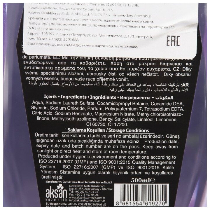 | Состав | Вода, Лауретсульфат Натрия, Кокамидопропил Бетаин, Кокамид DEA, Глицерин, Хлорид Натрия, Парфюм, Поликватерниум-7, Бензофенон-4, Тетразодиевая ЭДТА, Лимонная Кислота, Бензоат Натрия, Нитрат Магния, Метилхлоризотиазолинон, Метилизотиазолинон, CI 42090, CI 19140, CI 16035, CI 15985. |