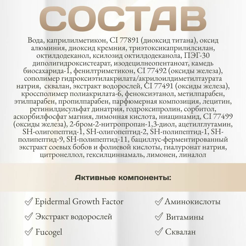| Состав | вода, каприлилметикон, CI 77891 (диоксид титана), оксид алюминия, диоксид кремния, триэтоксикаприлилсилан, октилдодеканол, ксилозид октилдодеканола, ПЭГ-30 диполигидроксистеарат, изодецилнеопентаноат, камедь биосахарида-1, фенилтриметикон, CI 77492 (оксиды железа), сополимер гидроксиэтилакрилата/акрилоилдиметилтаурата натрия, сквалан, экстракт водорослей, CI 77491 (оксиды железа), кроссполимер полиакрилата-6, феноксиэтанол, метилпарабен, этилпарабен, пропилпарабен, парфюмерная композиция, лецитин, ретинилдисульфат динатрия, годроксипролин, сорбитол, аскорбилфосфат магния, лимонная кислота, ниацинамид, CI 77499 (оксиды железа), 2-бром-2-нитропропан-1,3-диол, ацетилглутамин, SH-олигопептид-1, SH-олигопептид-2, SH-полипептид-1, SH-полипептид-9, SH-полипептид-11, бациллус-ферментированный экстракт соевых бобов и фолиевой кислоты, гиалуронат натрия, цитронеллол, гексилциннамаль, лимонен, линалол |