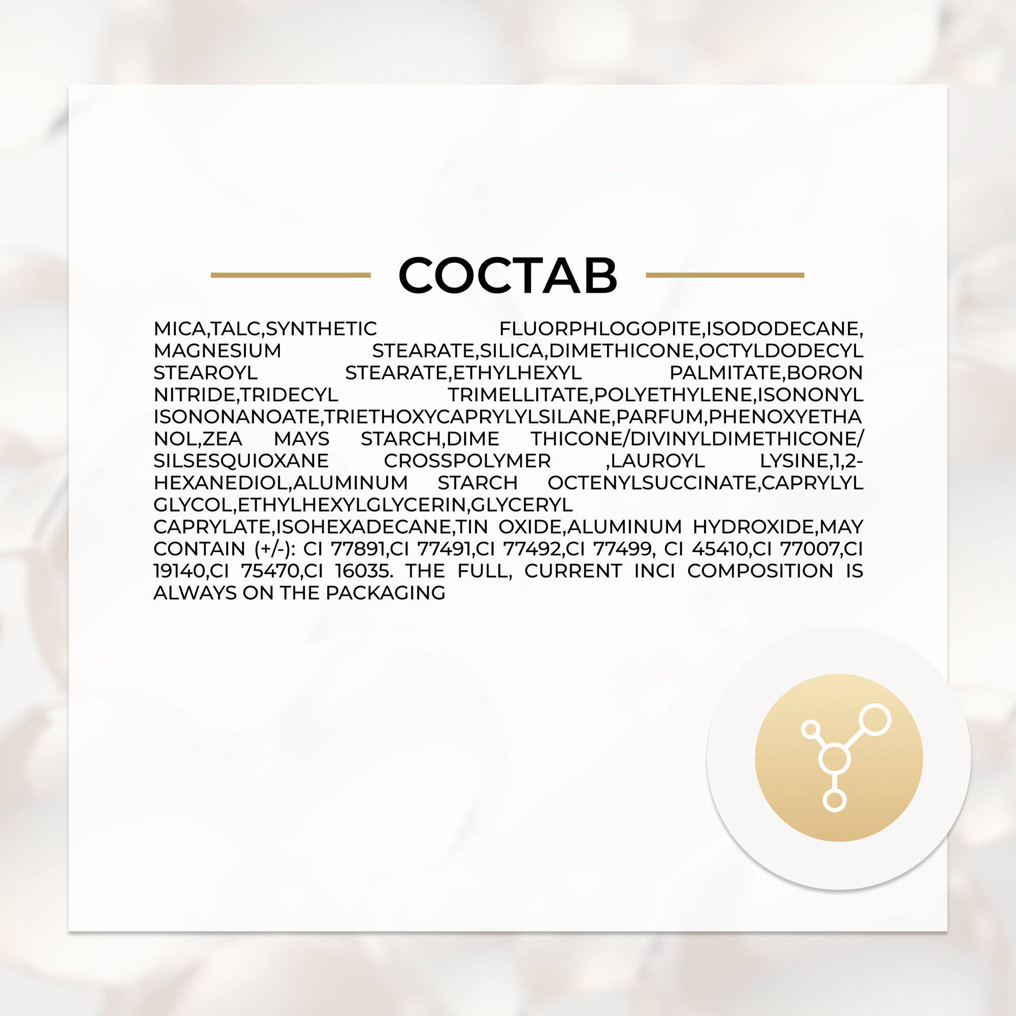 | Состав | Mica, Talc, Synthetic Fluorphlogopite, Isododecane, Magnesium Stearate, Silica, Dimethicone, Octyldodecyl Stearoyl Stearate, Ethylhexyl Palmitate, Boron Nitride, Tridecyl Trimellitate, Polyethylene, Isononyl Isononanoate, Triethoxycaprylylsilane, Parfum, Phenoxyethanol, Zea Mays Starch, Dimethicone/Divinyldimethicone/Silsesquioxane Crosspolymer, Lauroyl Lysine, 1,2-Hexanediol, Aluminum Starch Octenylsuccinate, Caprylyl Glycol, Ethylhexylglycerin, Glyceryl Caprylate, Isohexadecane, Tin Oxide, Aluminum Hydroxide, May Contain (+/-): CI 77891, CI 77491, CI 77492, CI 77499, CI 45410, CI 77007, CI 19140, CI 75470, CI 16035. |