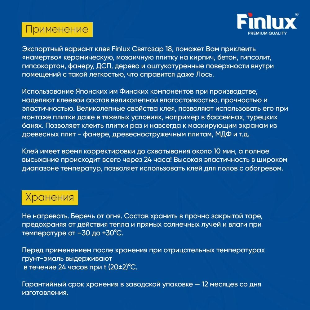 Плиточный клей для плитки керамической Finlux Святозар-18 быстрой фиксации, 7 кг интересное: