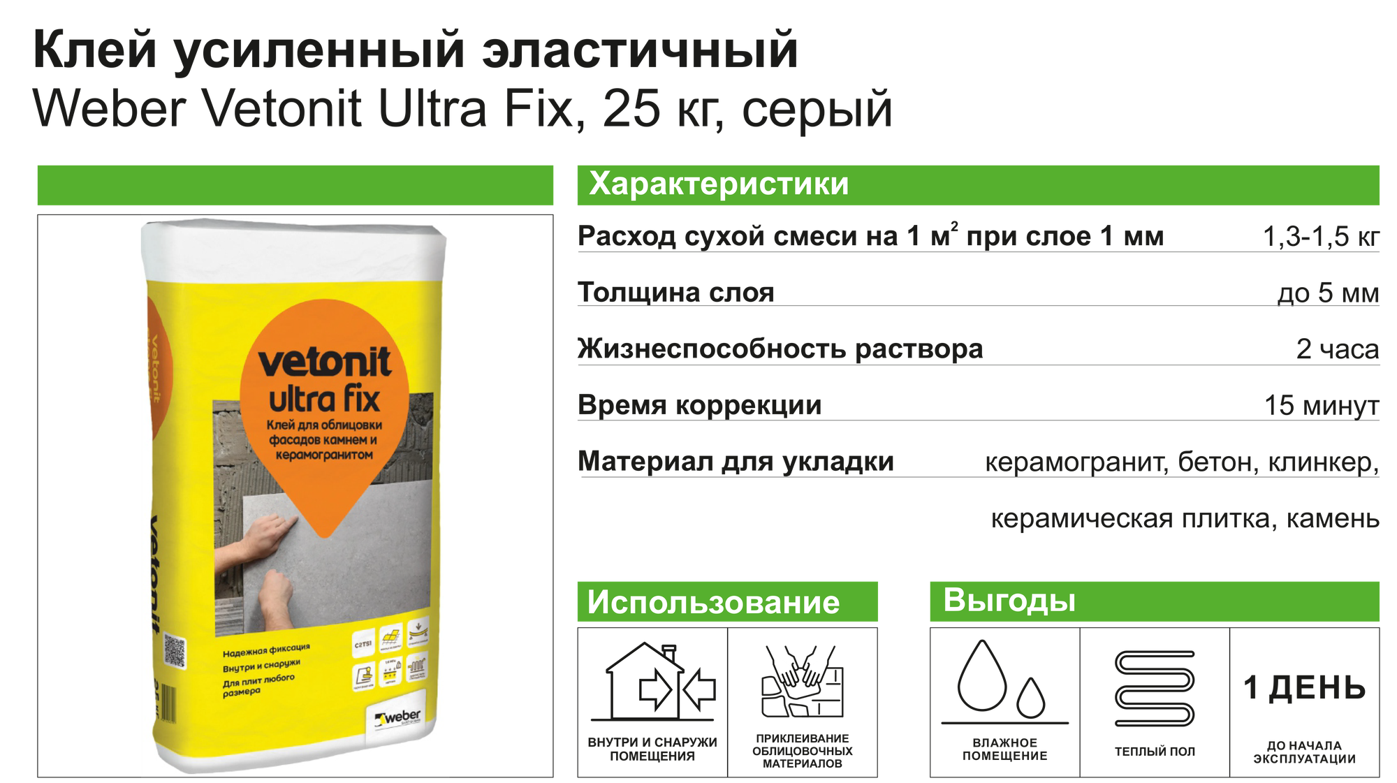 Вебер.ветонит Ультра Фикс клей для камня, керамогранита и мозаики (25кг) / WEBER.VETONIT Ultra Fix клей для фасадной облицовки камня и керамогранита (25кг) интересное: