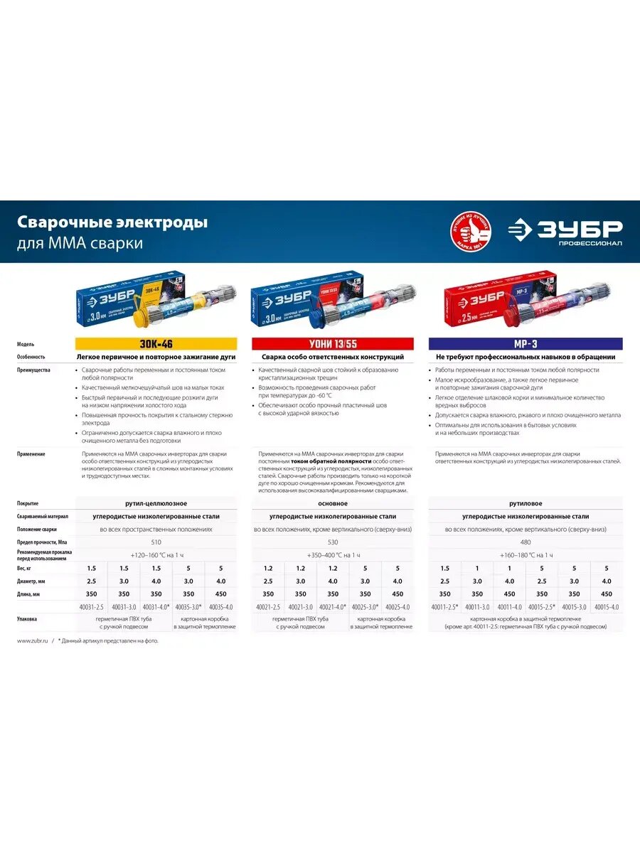 Ниже Вы можете прочитать отзывы на Электрод сварочный ЗУБР МР-3 с рутиловым покрытием, для ММА сварки, d 2,5 х 350 мм, 1,5 кг в ПВХ тубе. 40011-2.5, ознакомится с подробными характеристиками, посмотреть интересные обзоры и фотографии на Электрод сварочный ЗУБР МР-3 с рутиловым покрытием, для ММА сварки, d 2,5 х 350 мм, 1,5 кг в ПВХ тубе. 40011-2.5.