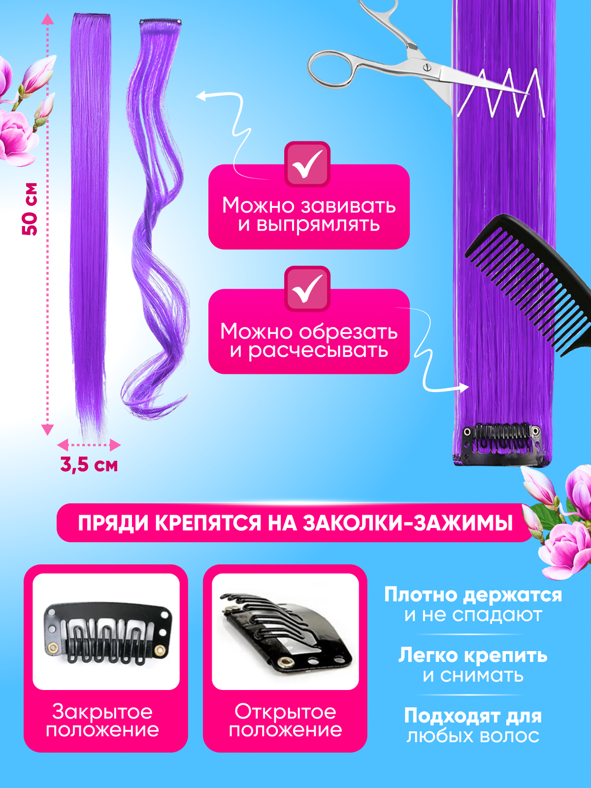 Цветные пряди на заколках 10 штук (фиолетовые)