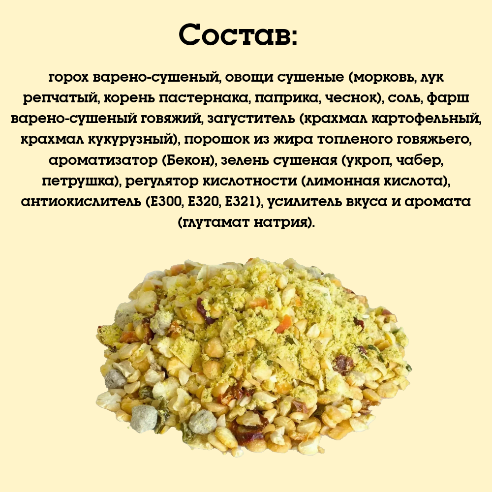 | Состав | горох варено-сушеный, овощи сушеные (морковь, лук репчатый, корень пастернака, паприка, чеснок), соль, фарш варено-сушеный говяжий, загуститель (крахмал картофельный, крахмал кукурузный), порошок из жира топленого говяжьего, ароматизатор (Бекон), зелень сушеная (укроп, чабер, петрушка), регулятор кислотности (лимонная кислота), антиокислитель (Е300, Е320, Е321), усилитель вкуса и аромата (глутамат натрия). |