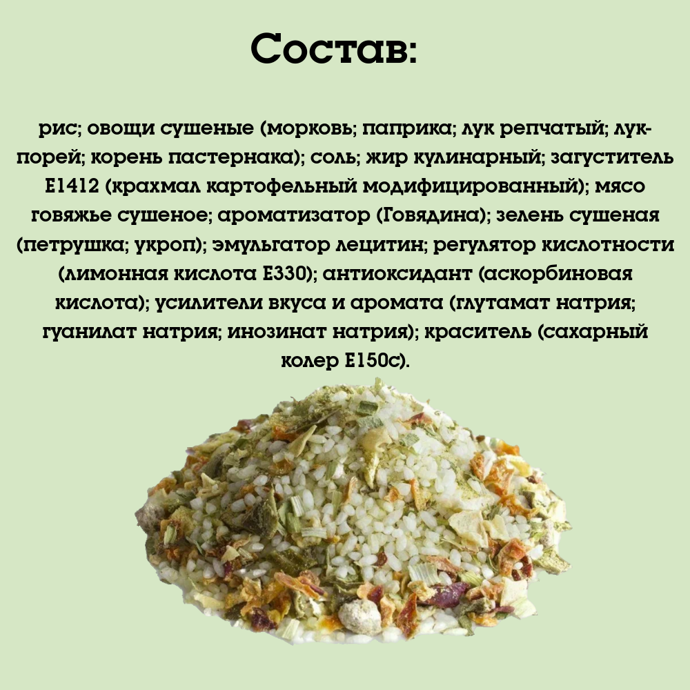 | Состав | рис; овощи сушеные (морковь; паприка; лук репчатый; лук-порей; корень пастернака); соль; жир кулинарный; загуститель Е1412 (крахмал картофельный модифицированный); мясо говяжье сушеное; ароматизатор (Говядина); зелень сушеная (петрушка; укроп); эмульгатор лецитин; регулятор кислотности (лимонная кислота Е330); антиоксидант (аскорбиновая кислота); усилители вкуса и аромата (глутамат натрия; гуанилат натрия; инозинат натрия); краситель (сахарный колер Е150с) |
