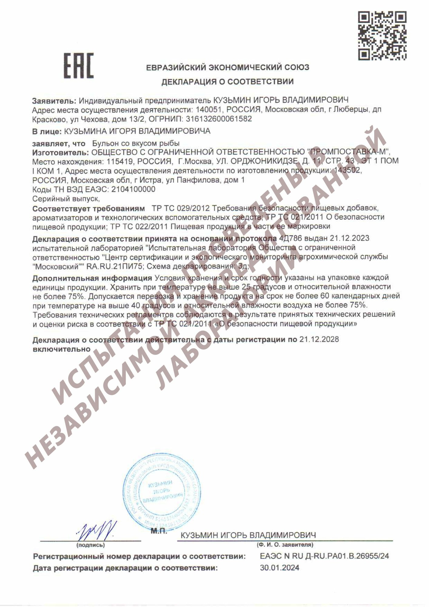 | Состав | соль пищевая, кукурузный крахмал, сахар, усилитель вкуса и аромата (глутамат натрия Е621), ароматизатор идентичный натуральному “Рыба”, лук репчатый, чеснок, зелень петрушки, перец красный острый, краситель (Е150) |