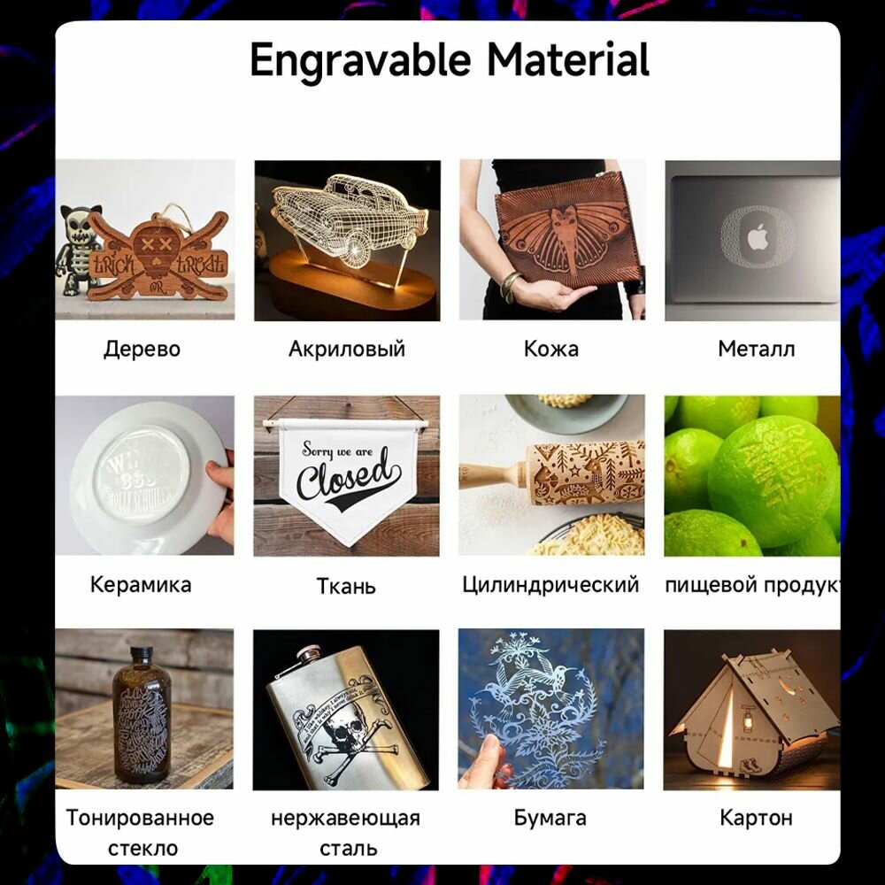 | Комплектация | Лазерный гравер, Блок питания (PSU), Сетевой кабель, USB-кабель, Защитные очки, Инструмент для фокусировки, Инструменты для сборки, Руководство по эксплуатации, Крепежные элементы, Кабельные стяжки, Антенна Wi-Fi, Образцы материалов |