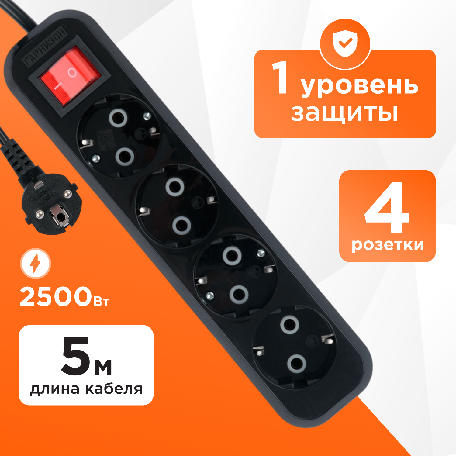Купить Удлинитель Гарнизон черный 10А 5м с выключателем и заземлением 1 уровень защиты EPB-G4-B-5