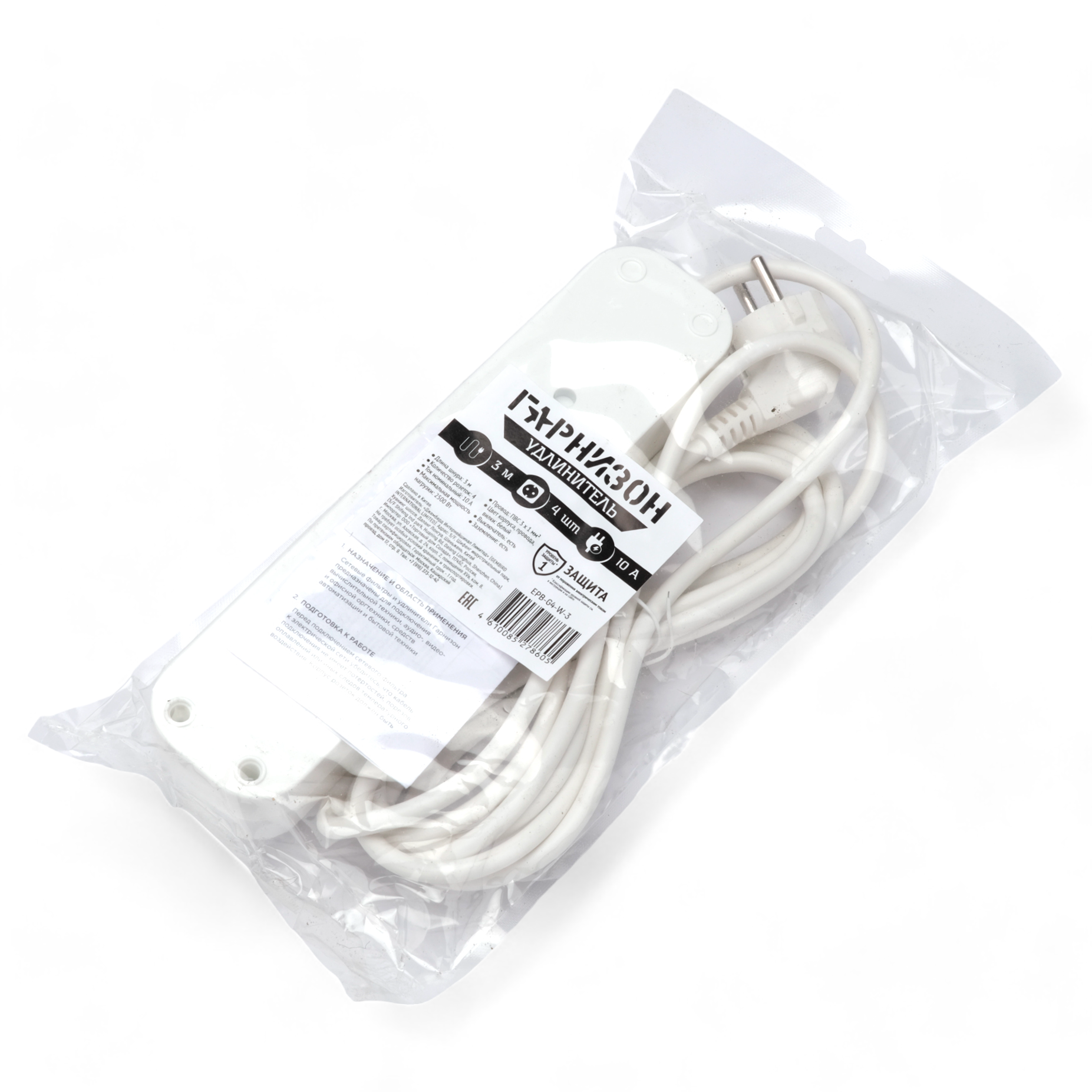 Удлинитель Гарнизон белый 10А 2м с выключателем и заземлением 1 уровень защиты EPB-G4-W-2