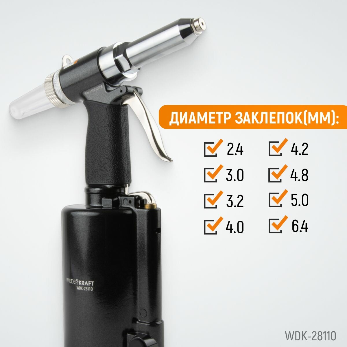 WIEDERKRAFT Пневмогидравлический заклепочник 2.4, 3.2, 4.0, 4.8, 6.4 мм, усилие 14000 n WDK-28110