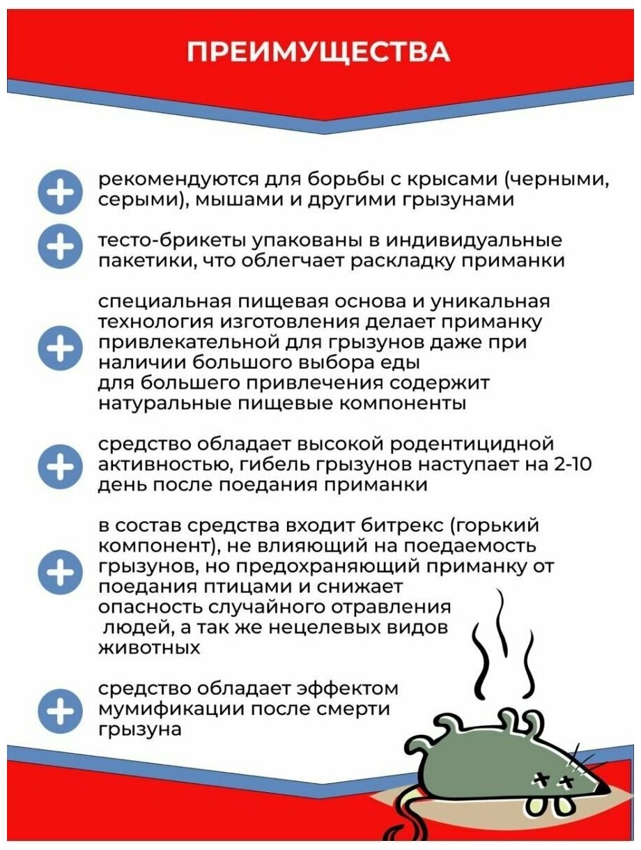 | Состав | Содержит в качестве действующего вещества (ДБ) антикоагулянт второго поколения - бродифакум- 0,005%, а также битрекс (горький компонент), предохраняющий приманки от поедания птицами и снижающий опасность случай-ного отравления людей и нецелевых видов животных, краситель, аттрактант, масло растительное, консервант и пищевые наполнители. |
