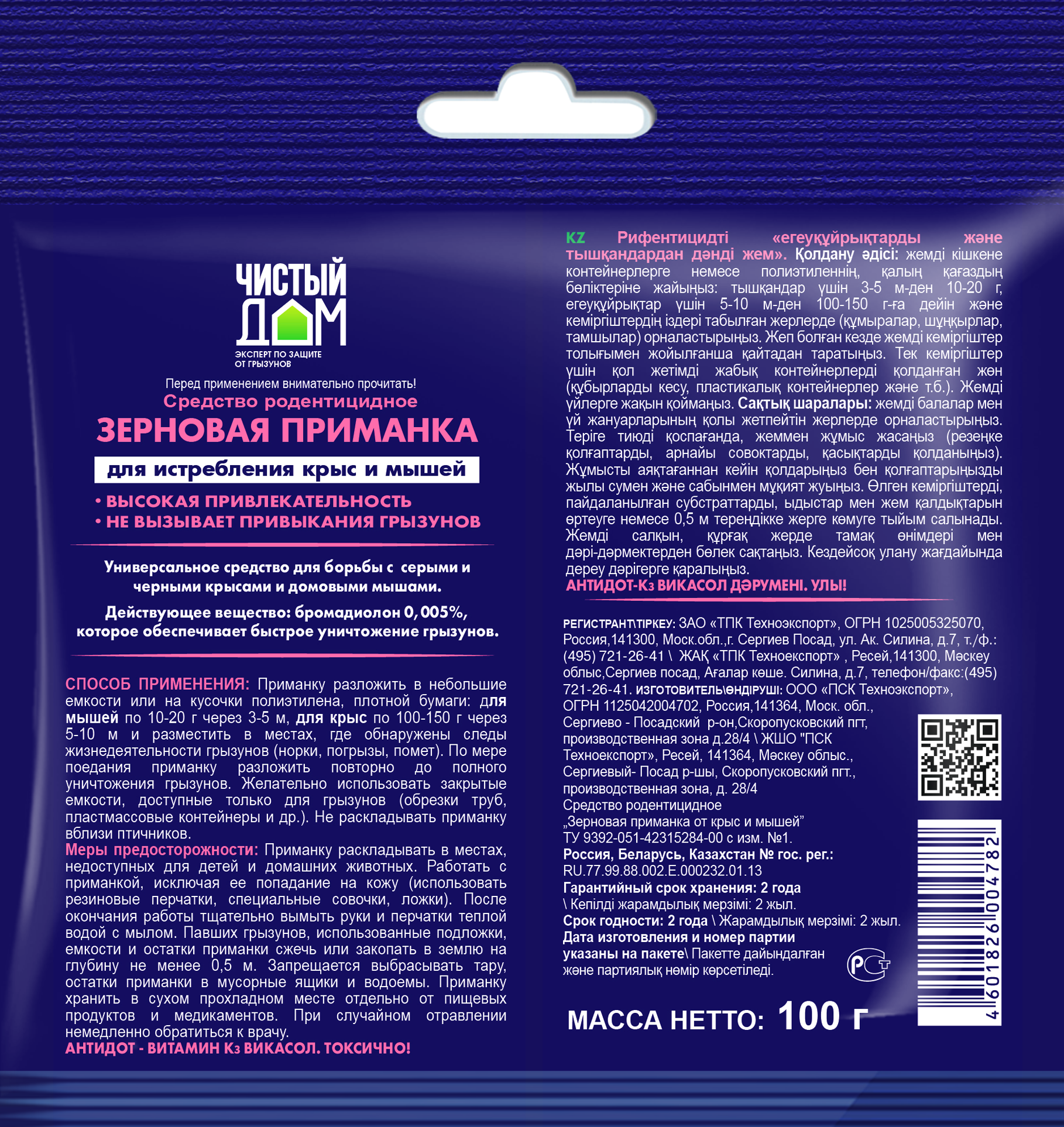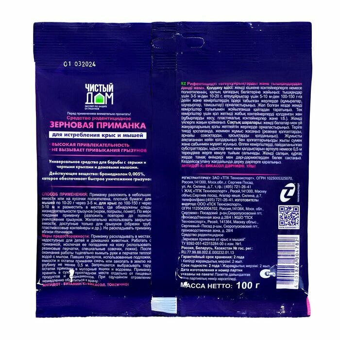 Комплект Родентицидное средство от крыс и мышей Чистый Дом зерновая приманка 100 гр. х 2 уп.
