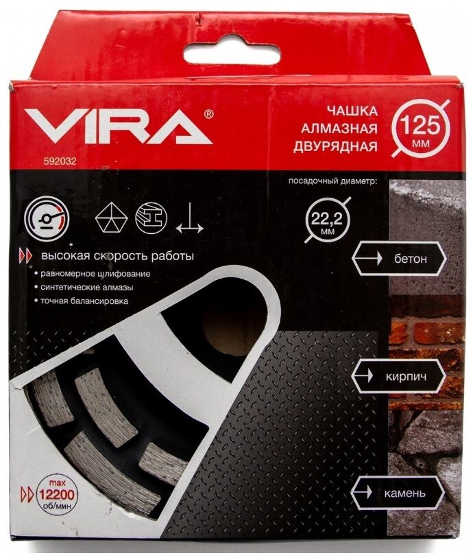 Ниже Вы можете прочитать отзывы на Vira Чашка алмазная двурядная 125 мм 592032 ., ознакомится с подробными характеристиками, посмотреть интересные обзоры и фотографии на Vira Чашка алмазная двурядная 125 мм 592032 ..