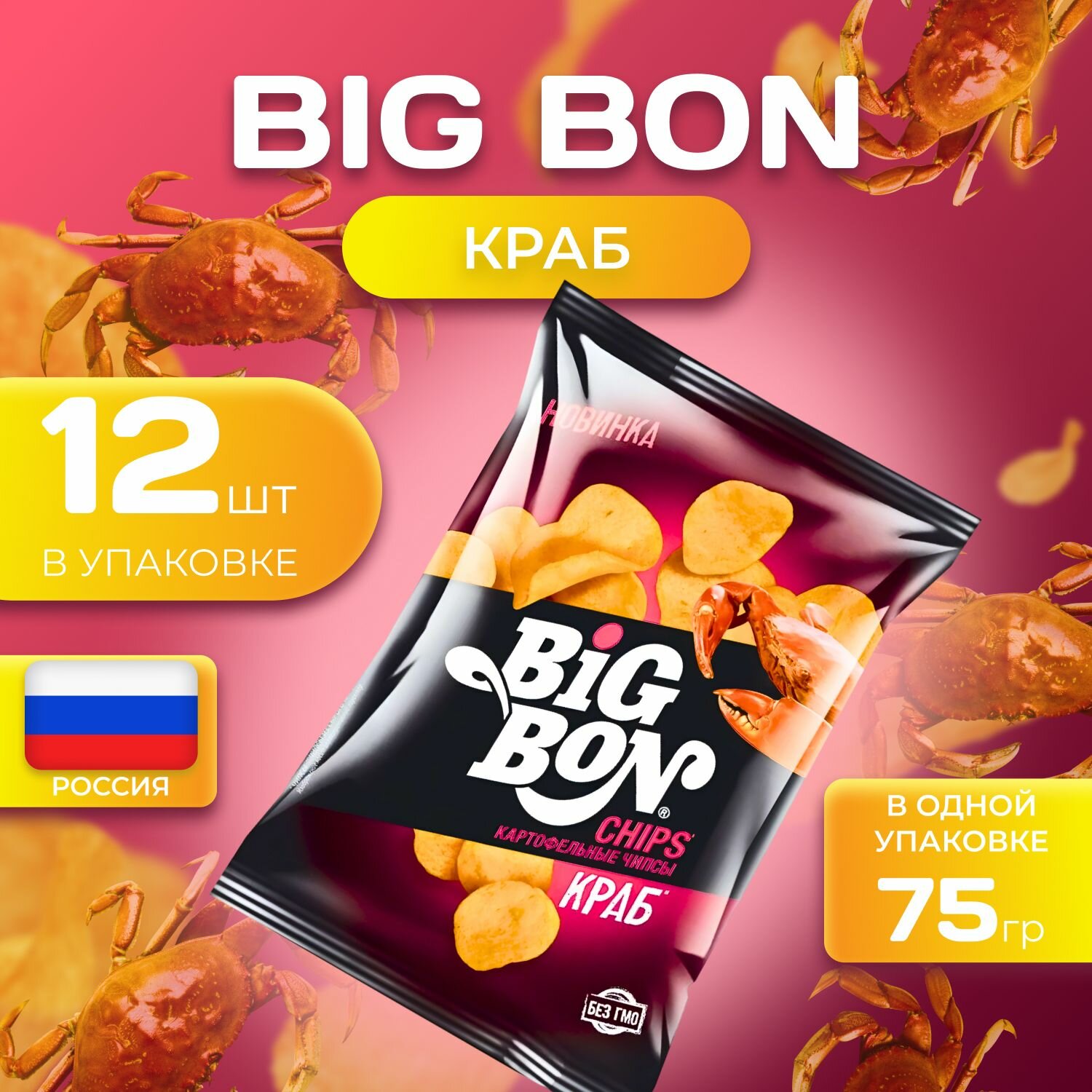 Упаковка 12 штук Чипсы Big Bon краб пак 75г Беларусь