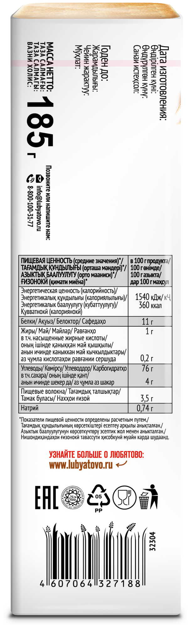 | Дополнительная информация | продукт содержит глютен, сульфиты; может содержать следы молочного белка, сои; хранить в сухих проветриваемых помещениях при температуре 18±3 'С и относительной влажности воздуха не более 75%, без воздействия прямого солнечного света |