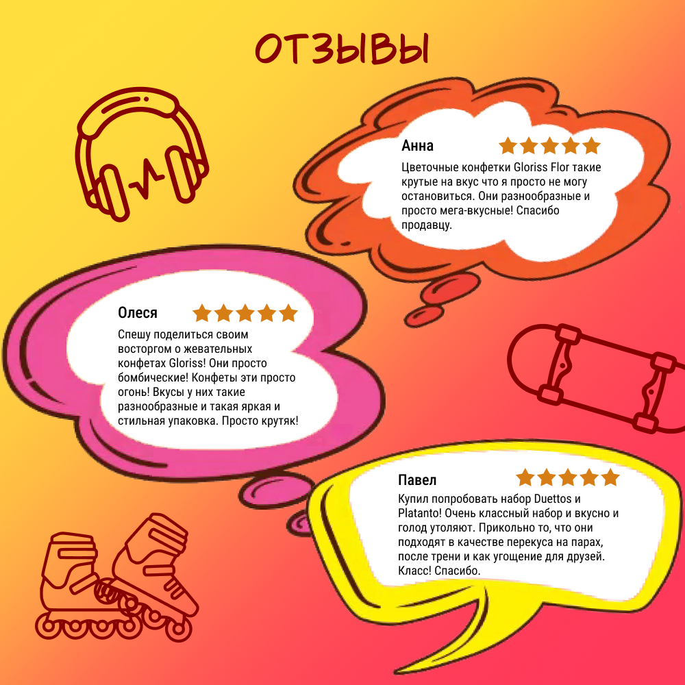 Набор ассорти жевательных конфет Gloriss: Манго-малина 2 шт., Тутти-фрутти 2 шт., Ассорти 2 шт., Три шоколада 2 шт., 8 шт. по 35 г.