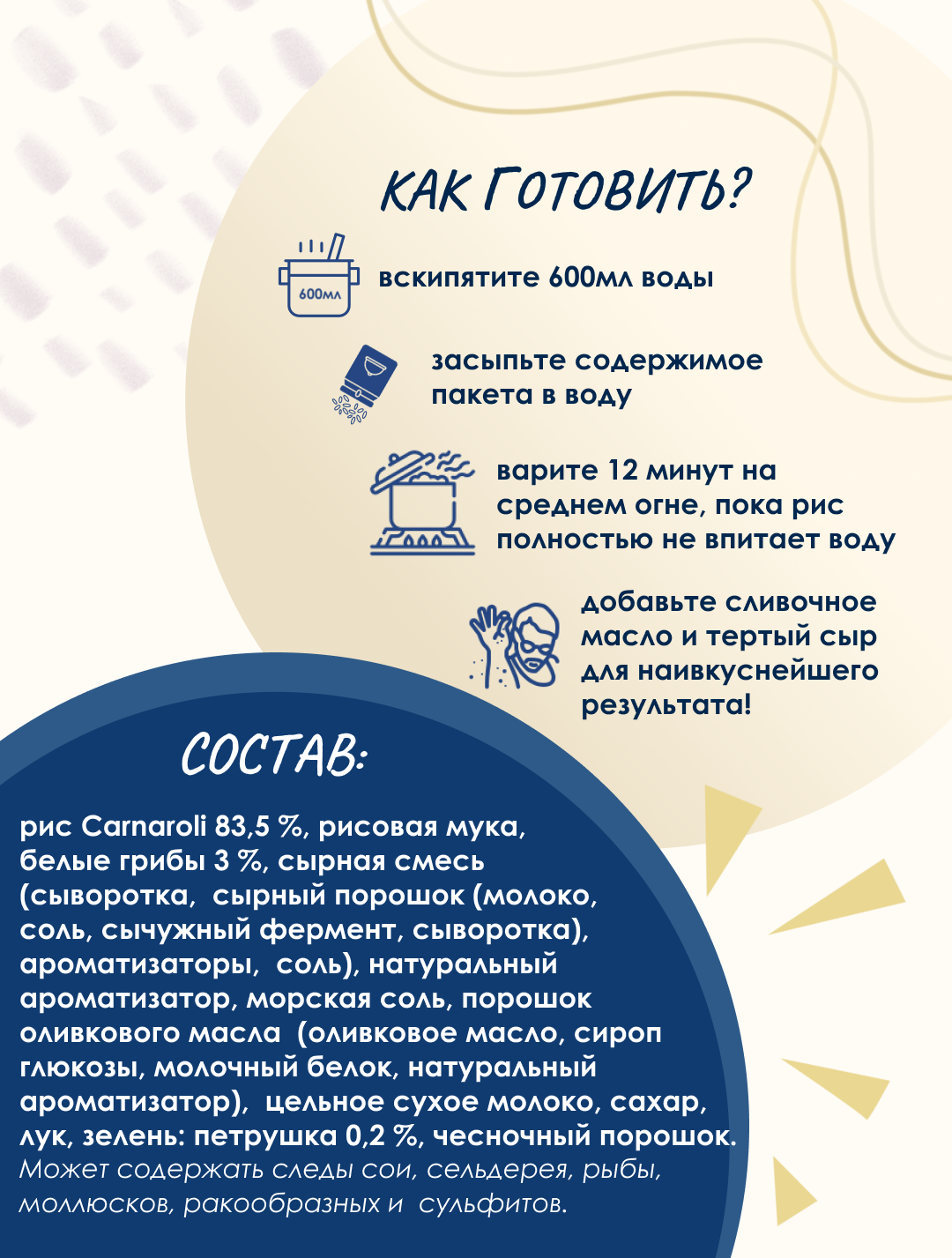 | Состав | рис 88%, рисовая мука, белые грибы 2,4%, сухой бульон (соль, натуральный ароматизатор: «дрожжевой экстракт»; декстроза, картофельный крахмал, сахар, специи: мацис, куркума; луковый порошок, чесночный порошок, томатный порошок), натуральный ароматизатор: «дрожжевой экстракт»; соль, рисовый крахмал, оливковое масло, лук, петрушка, сироп глюкозы, молочный белок |