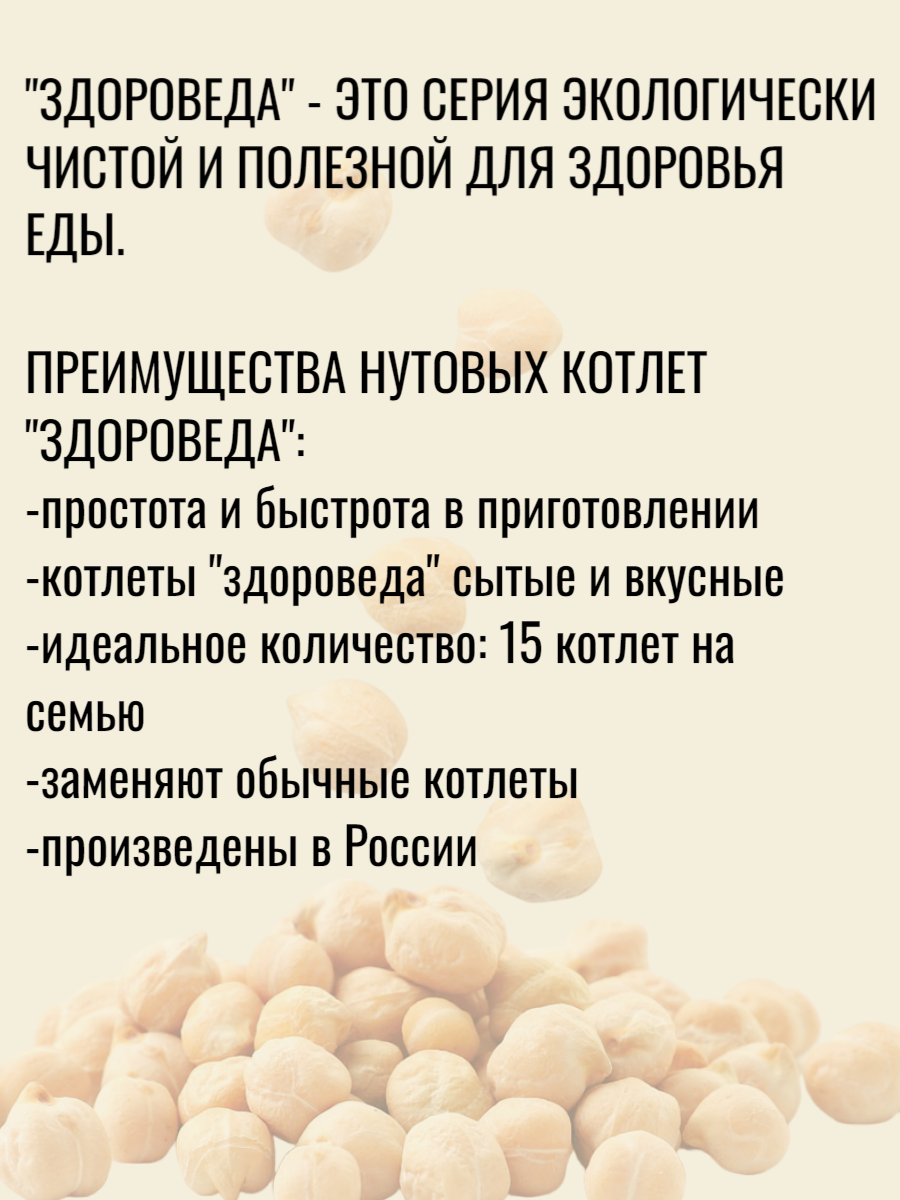 Ниже Вы можете прочитать отзывы на Здороведа Котлеты нутовые 280 г, ознакомится с подробными характеристиками, посмотреть интересные обзоры и фотографии на Здороведа Котлеты нутовые 280 г.