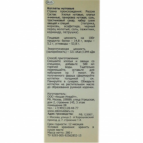 | Состав | хлопья нутовые, хлопья ячменные, панировка нутовая, соль, тростниковый сахар, набор сухих овощей и специй: морковь, паприка, чеснок, перец черный молотый, семена пажитника молотые, кориандр молотый, петрушка |