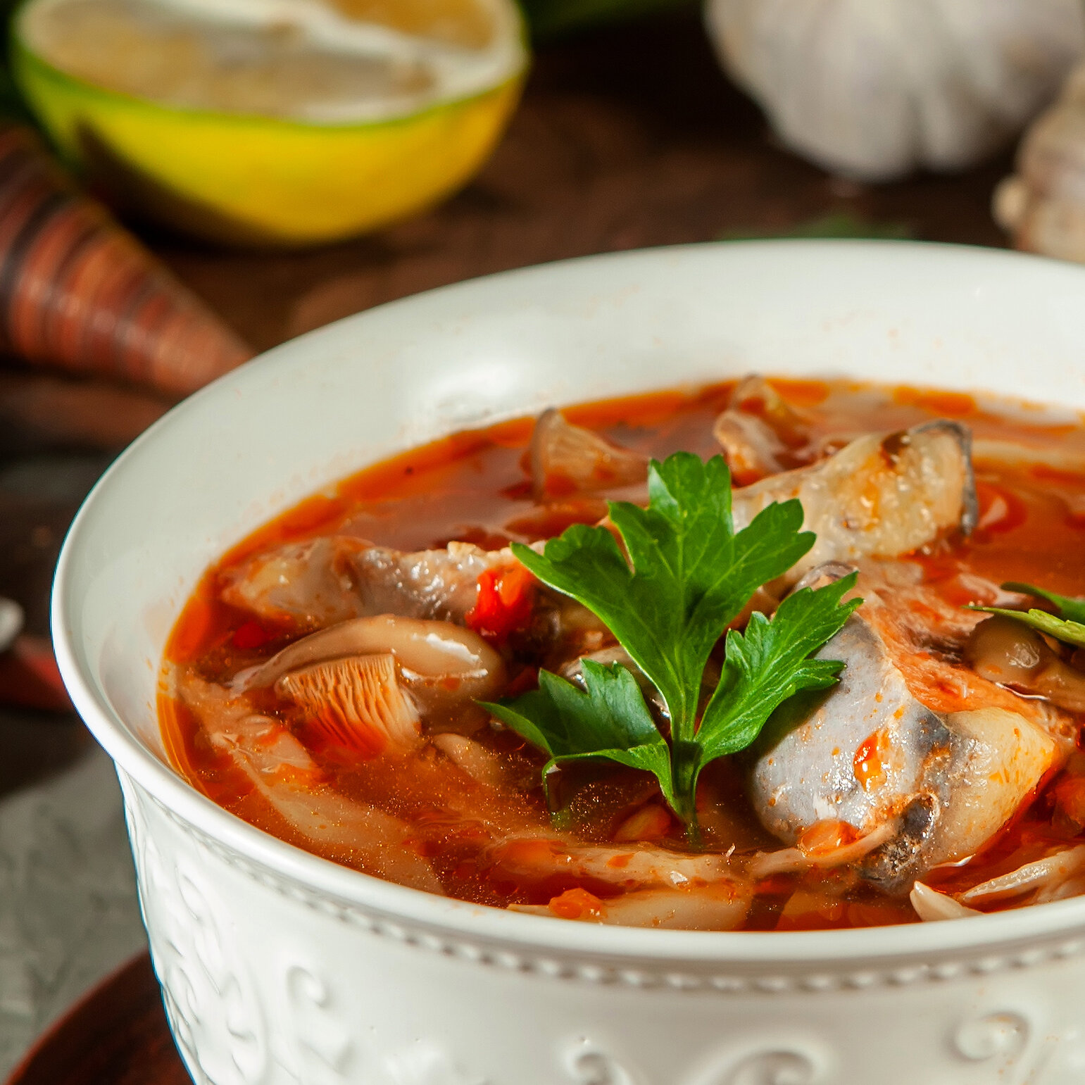 | Состав | вода, осетр (70г), грубы вешенки, лук, перец чили, масло подсолнечное рафинированное, кинза, имбирь, томатная паста (томаты), сок лайма, чеснок, соль. |