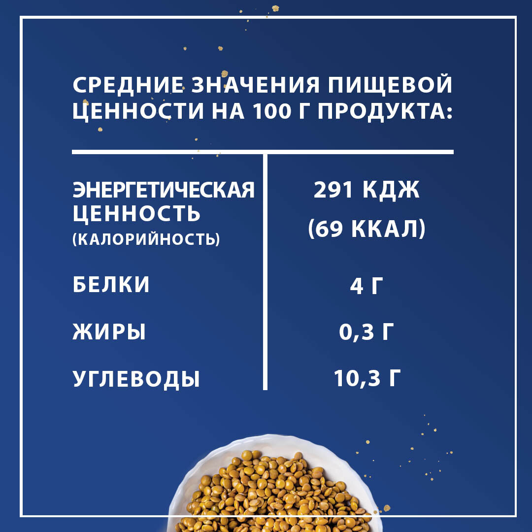 | Состав | чечевица восстановленная, вода питьевая, соль, антиокислитель: аскорбиновая кислота |