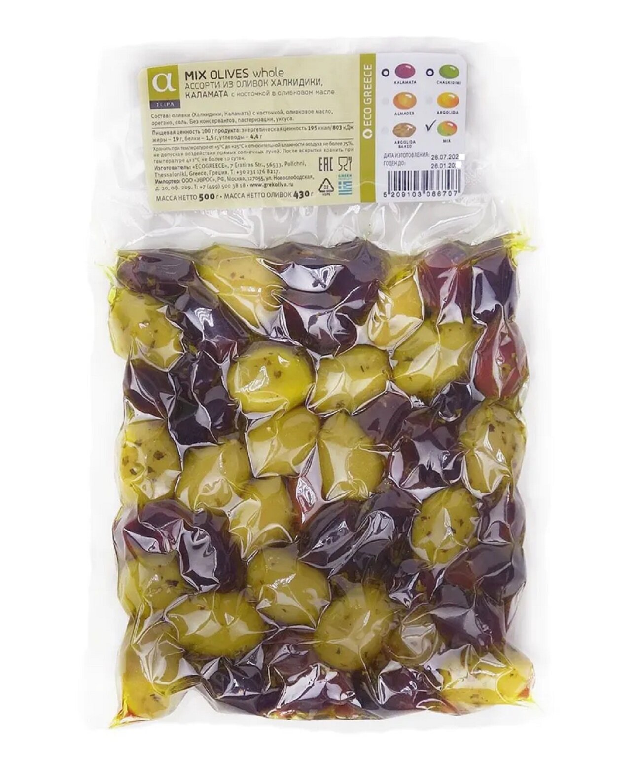 Оливки греческие крупные ассорти Халкидики + Каламата с косточкой в оливковом масле EcoGreece (А-серия), вакуум, 500 г