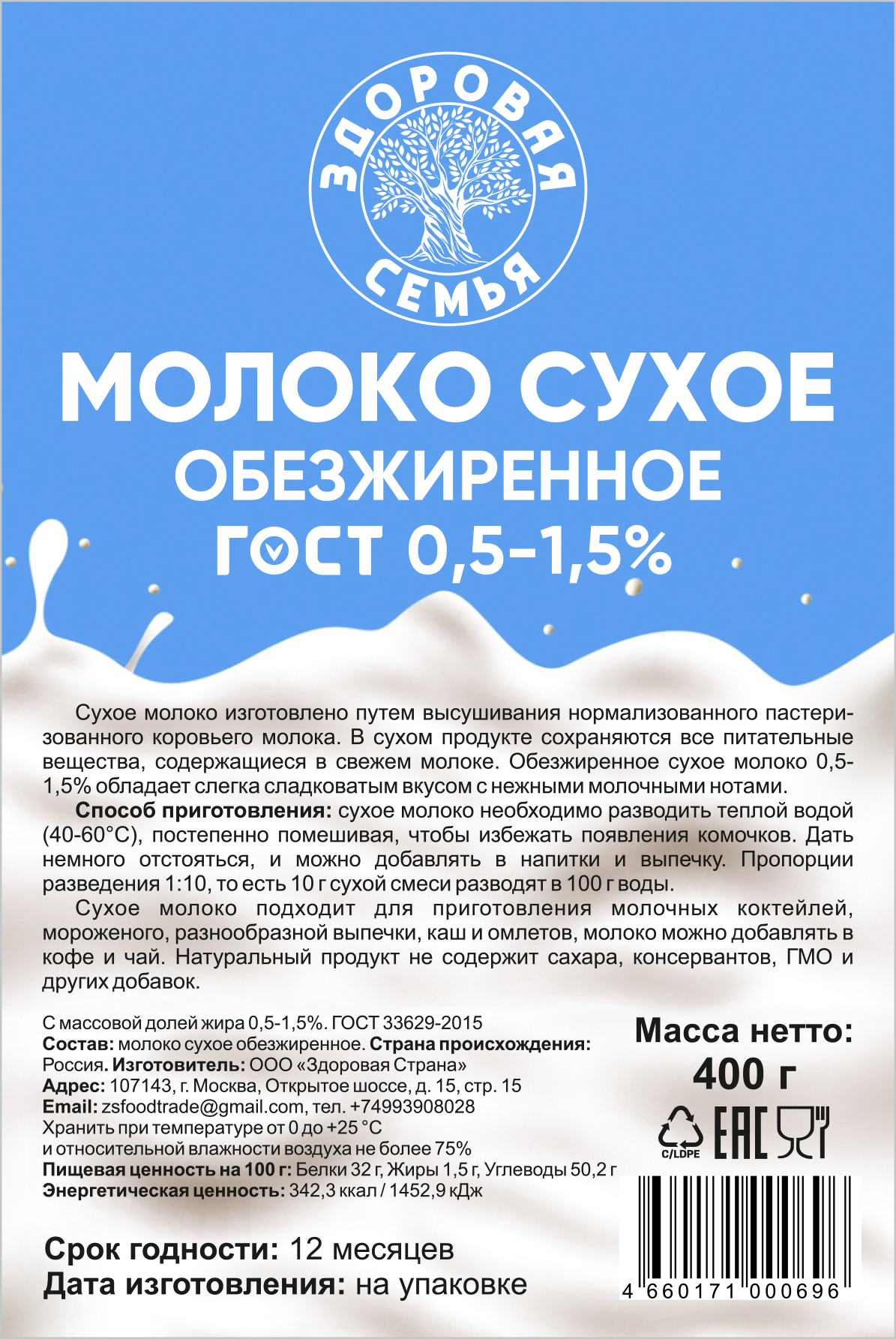 Молоко сухое Здоровая Семья обезжиренное 0.5-1.5% ГОСТ, 400 г