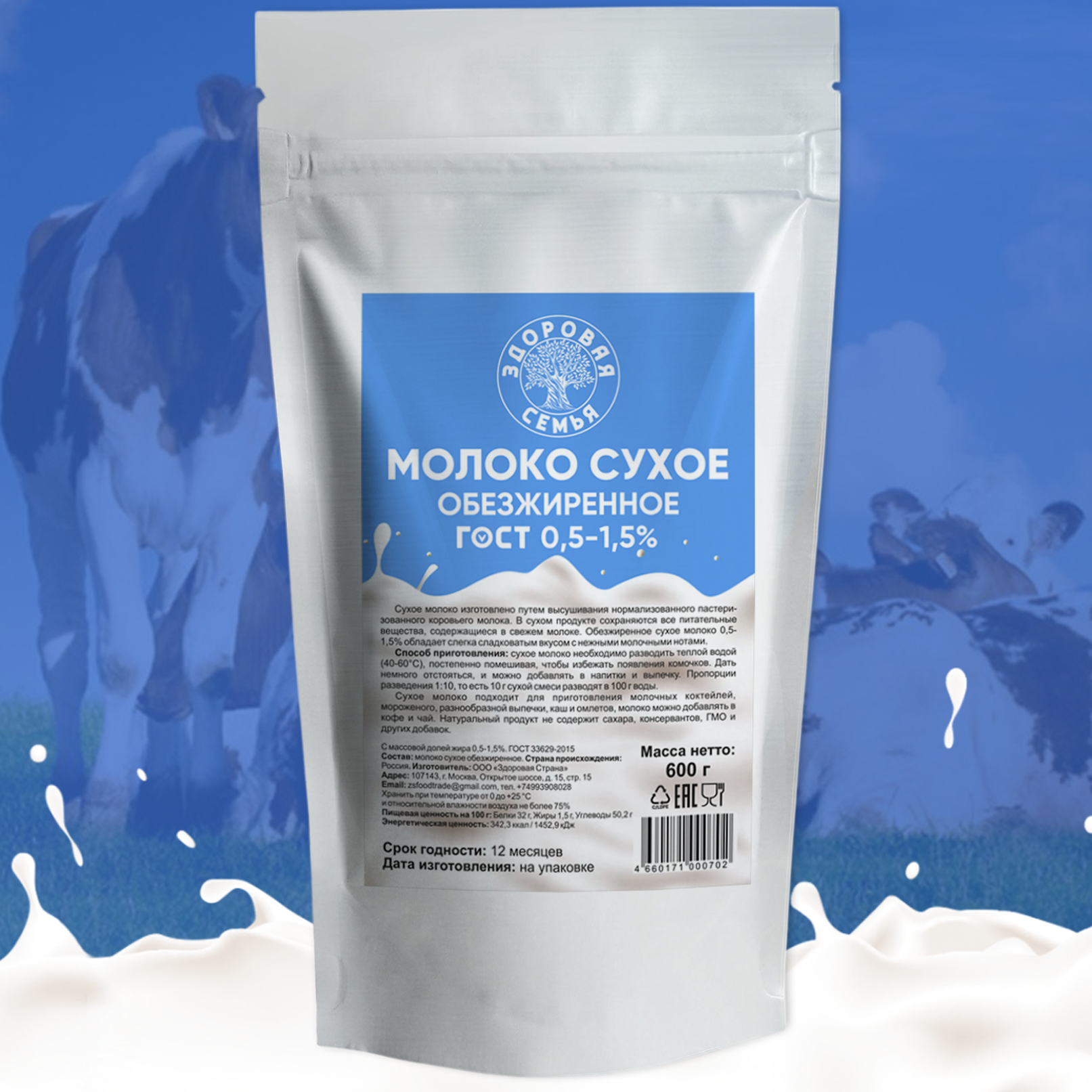 Купить Молоко сухое Здоровая Семья обезжиренное 0.5-1.5% ГОСТ, 600 г, натуральное, заменитель молока для чая, кофе и выпечки, без сахара